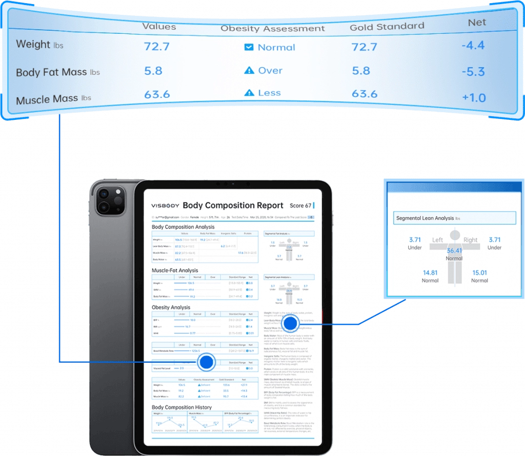 - Surveillance et gestion de la santé: La technologie Visbody fournit des informations précieuses sur les changements de composition corporelle au fil du temps. Pour ceux qui gèrent des conditions comme l’obésité ou la sarcopénie, des analyses régulières peuvent suivre les progrès et ajuster les plans de traitement. Les données détaillées aident également à surveiller les tendances globales en matière de santé, permettant des stratégies de santé proactives et personnalisées.
