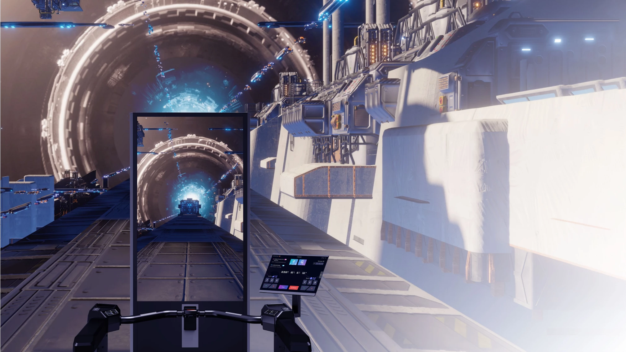 - Högflödessportfläkt: Den mäktiga, justerbar fläkt simulerar naturlig vind, förstärker realism och ger en kyld, miljö med hög syrehalt för bästa prestanda.