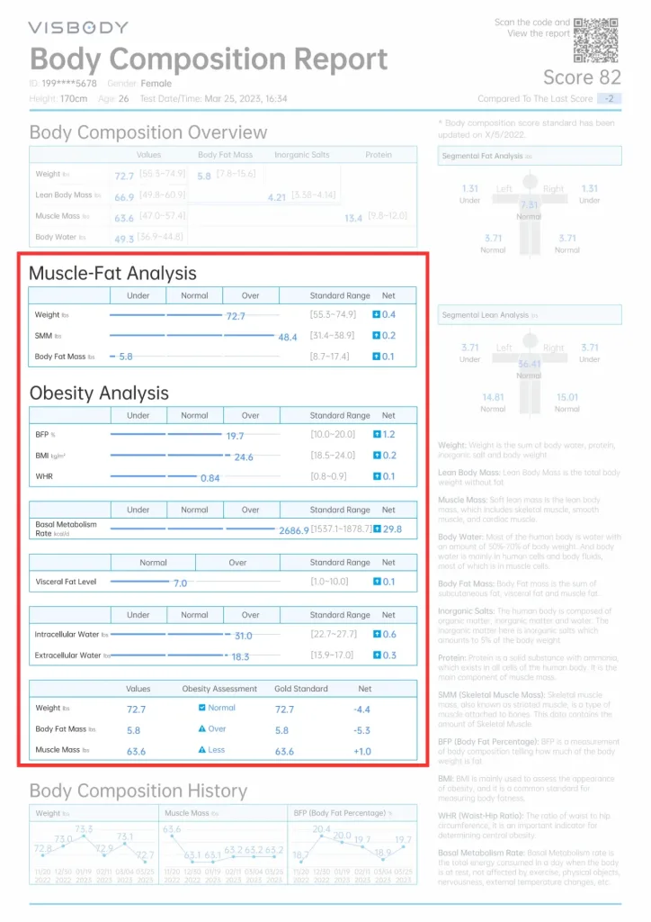 Vücut yağ analizörü ve vücut yağ makinesi kullanarak, Visbody'nin sistemi bir kişinin vücudunu doğru bir şekilde tarayabilir ve yağ konsantrasyonunun belirli alanlarını belirleyebilir. Visbody, BMI'ınız hakkındaki verileri içeren kas-yağ analizini ve obezite analizini kullanır, bel-kalça oranı, iç organ yağ seviyesi, vucut suyu, ve daha ayrıntılı ve kişiselleştirilmiş sonuçlar sağlamak için daha birçok test.