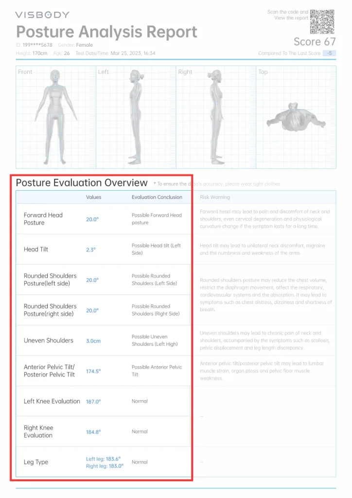Visbody'nin 3 boyutlu vücut tarayıcıları baş duruşu gibi çeşitli testleri gerçekleştiriyor, baş eğme, yuvarlak omuz duruşu, düzensiz omuzlar, ön pelvik eğim/arka pelvik eğim, ve sol ve sağ diz değerlendirmesi. Bu değerleri test etmek, kırılganlık durumunuzu ve postüral hareketliliğinizi daha iyi değerlendirmemizi sağlar.