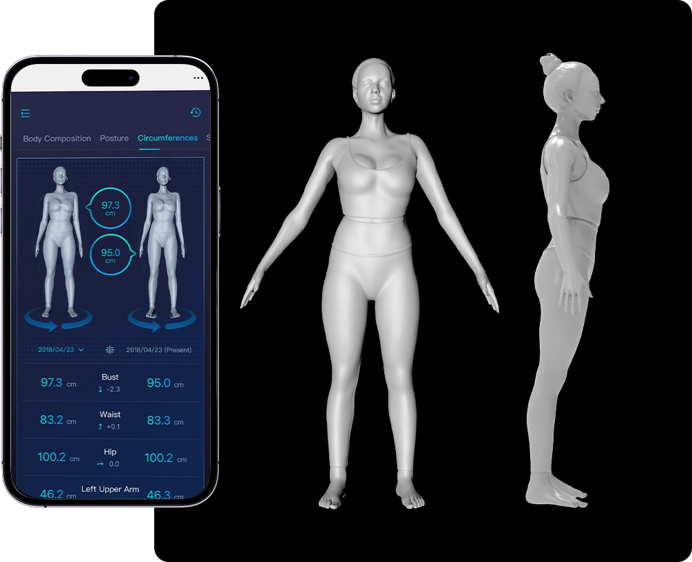 - 13 Circumference Measurements: Measure key body parts quickly using depth-sensing cameras and self-developed algorithms.